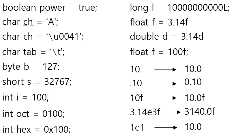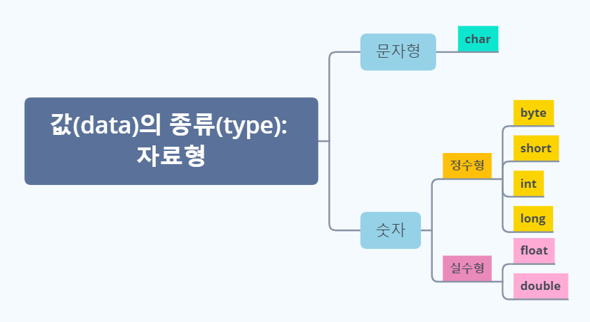 - 기본자료형(Primitive Type): 숫자, 문자, 논리, 바이트