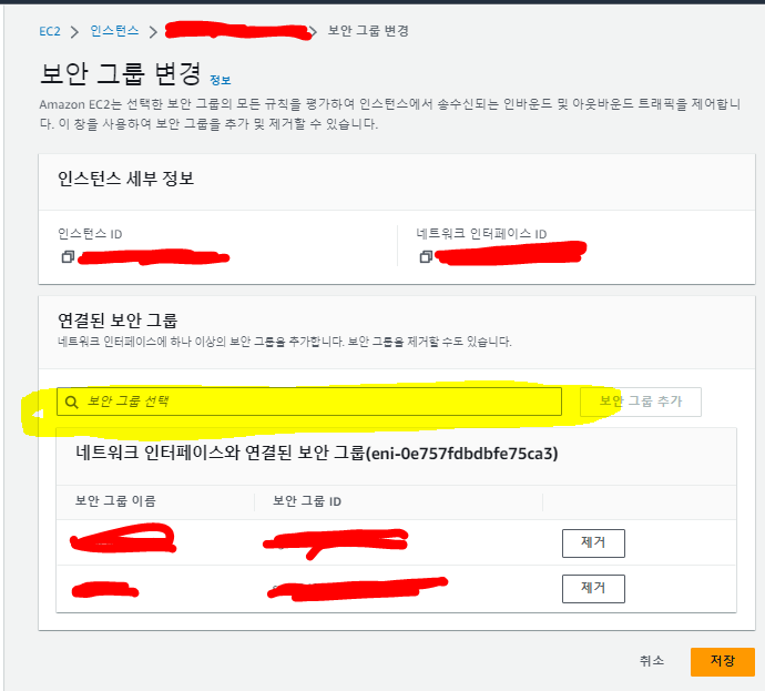 보안 그룹 변경 화면에서 검색창 클릭하여 금방 설정한 보안그룹 선택하고 추가.기존 거 필요없으면 제거해주세요.