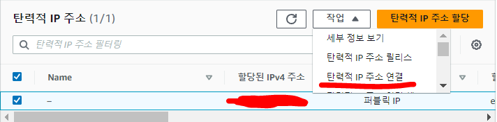 아직 탄력적IP주소 연결하지 않아 아무것도 보이지 않을 수 있다.