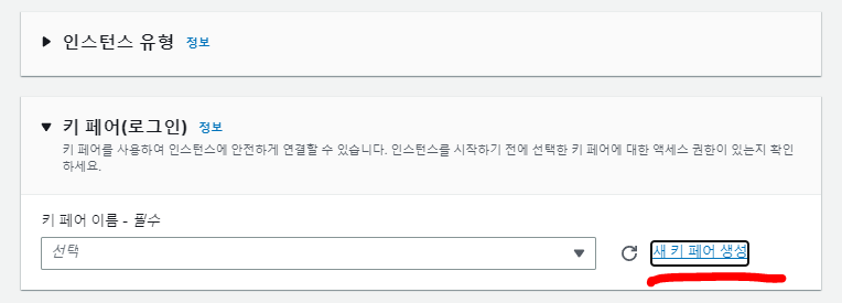인스턴스 유형을 건너뛰고 바로 새 키패어 생성을 할 것이다.