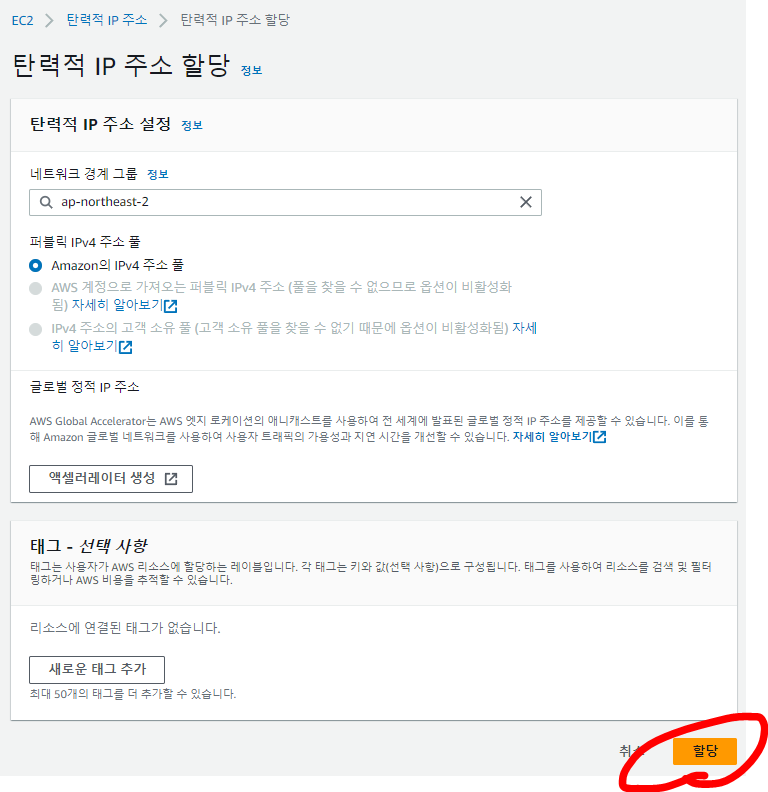 step2. 오렌지색 탄력적 IP 주소할당 버튼을 클릭 및 할당