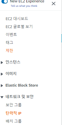 step1. 왼쪽 메뉴창에서 네트워크 및 보안> 탄력적 IP 클릭합시다.