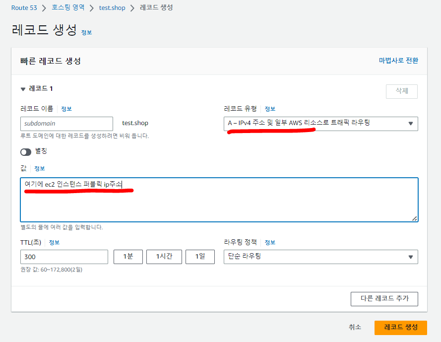 레코드 값에 본인의 ec2 인스턴스 퍼블릭 ip주소를 입력하고 레코드 생성