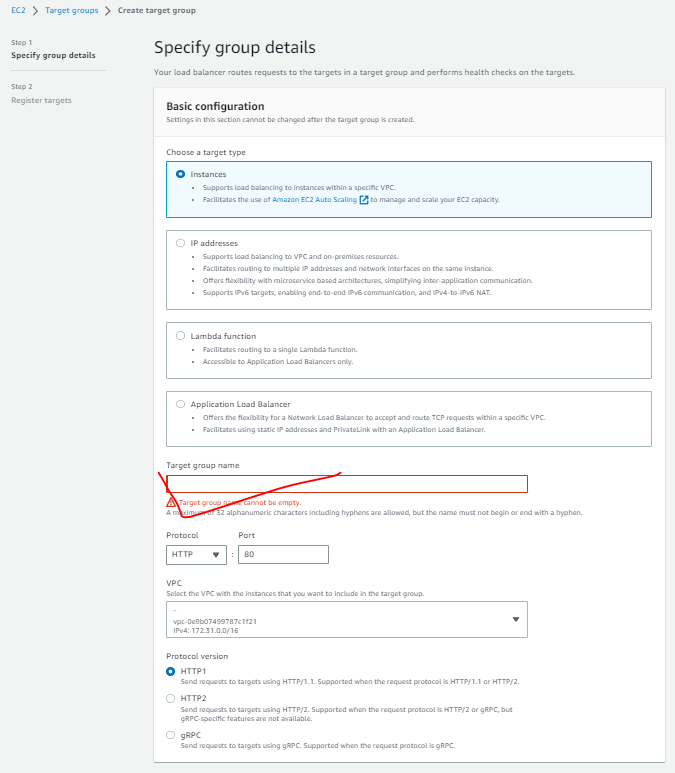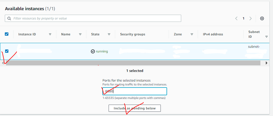 체크 > 8080입력 > Include as pending below 클릭 > Register pending targets 버튼을 눌러 target group 을 생성한다