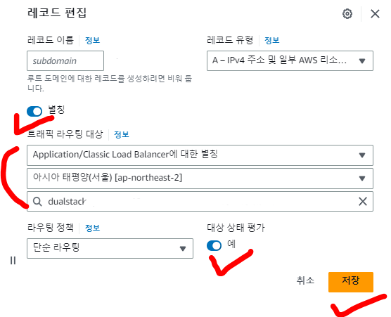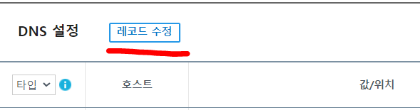 DNS 설정 화면에서 설정> 레코드 수정 > 값/ 위치를 ec2 인스턴스 IP 주소로 변경하고 확인 및 저장 예: 12-345-67-89