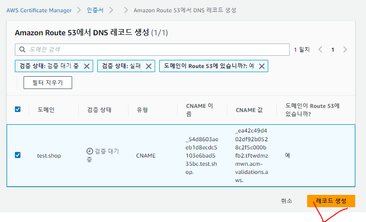 인증서 ID 클릭 > Route 53에서 레코드 생성 > 레코드 생성