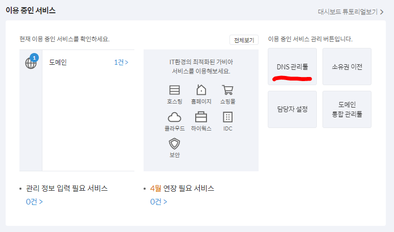 구매 완료하면 오른쪽 상단의 MY 가비아 클릭 > 이용중인 서비스 > DNS 관리툴