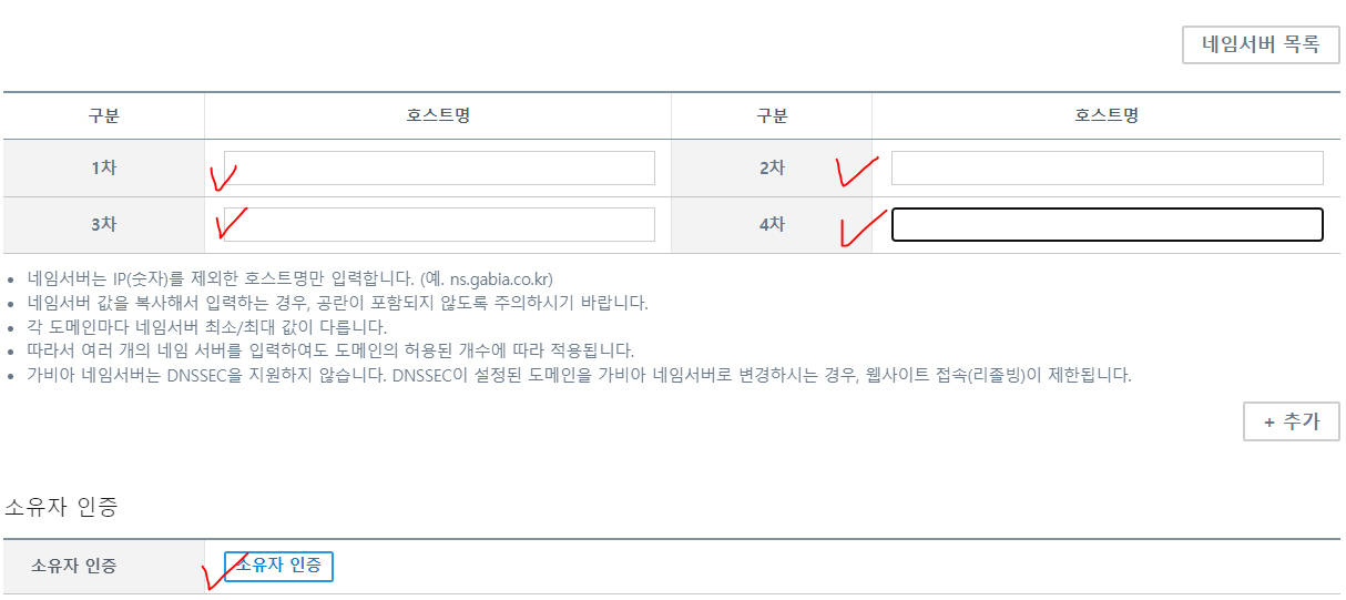 금방 Route53에서 복사한 값/ 트래픽 라우팅 대상 값 4개를 각 호스트명에 하나씩 복사해서 넣는다.