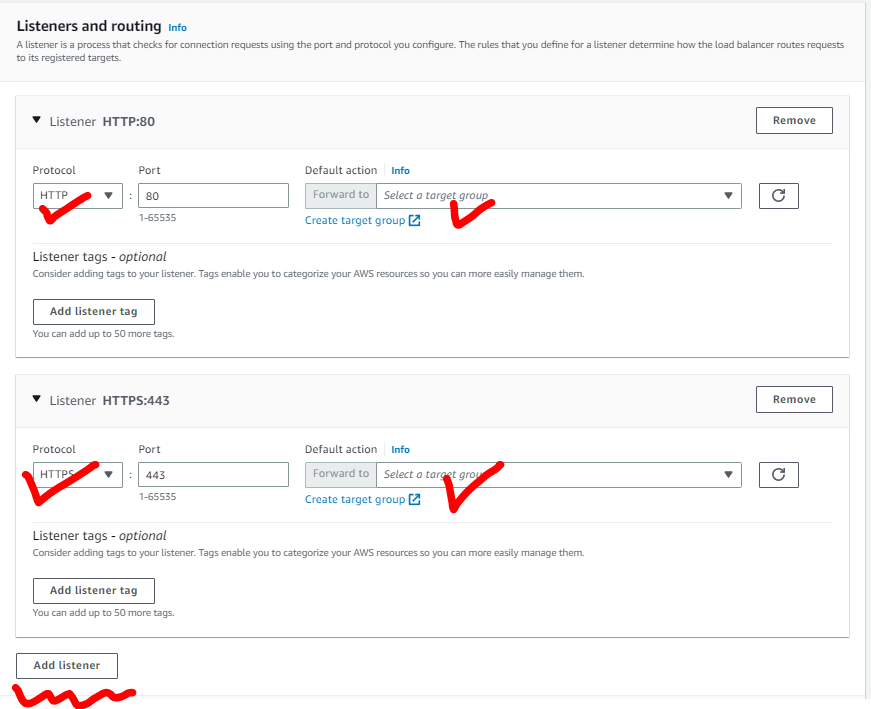 HTTO, HTTPS 프로토콜 리스너를 선택해주고 위에서 만든 대상그룹을 선택해줘야 한다.
