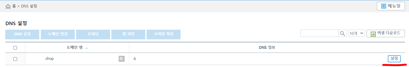 홈 > 전체도메인 > 구매한 도메인 명 클릭> 네임서버 설정 클릭